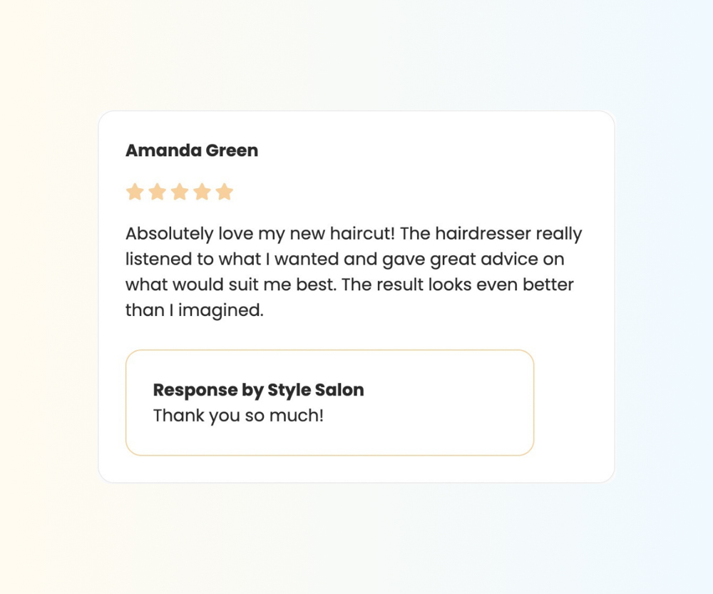 Collect Salonround Reviews, Google Reviews, Trustpilot Reviews, or Facebook Reviews. Choosing Salonround Reviews? Easily view reviews, respond to them, and showcase reviews on your website.