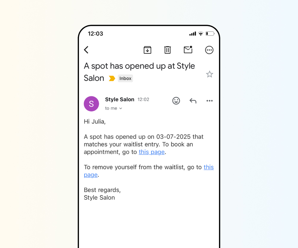 You can use the waitlist feature to make sure no opening goes unused and to maximize your revenue. If there's no availability on the client’s preferred day or time, they can join the waitlist-or you can add them yourself. Once a spot becomes available, you can contact the client. You can also enable the automatic waitlist, which means clients on the waitlist will automatically receive an email when there's new availability.