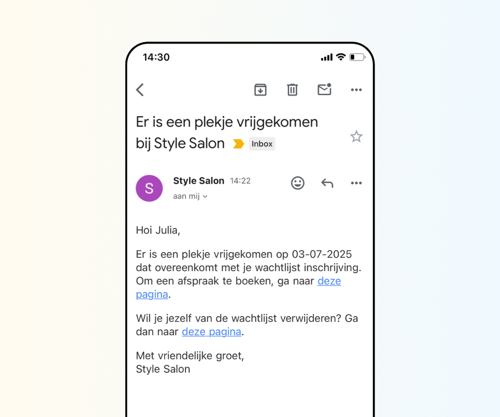 Je kunt de wachtlijstfunctie gebruiken om ervoor te zorgen dat geen enkele plek ongebruikt blijft. Als er geen plek is op de door de klant gewenste dag of tijd, dan kan de klant zich op de wachtlijst zetten - of jij voegt de klant zelf toe. Zodra er een plek vrijkomt, krijg je een melding en kun je de klant laten weten dat er een plek vrijgekomen is. Je kunt ook de automatische wachtlijst inschakelen, waardoor klanten op de wachtlijst automatisch een e-mail ontvangen zodra er weer plek is.