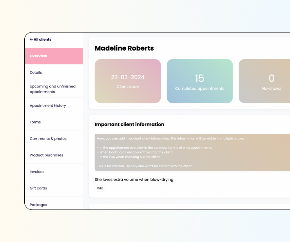 Share elements between locations when useful, such as client profiles and marketing tools, while keeping other data, like the calendar, opening hours, and stock management, separate.