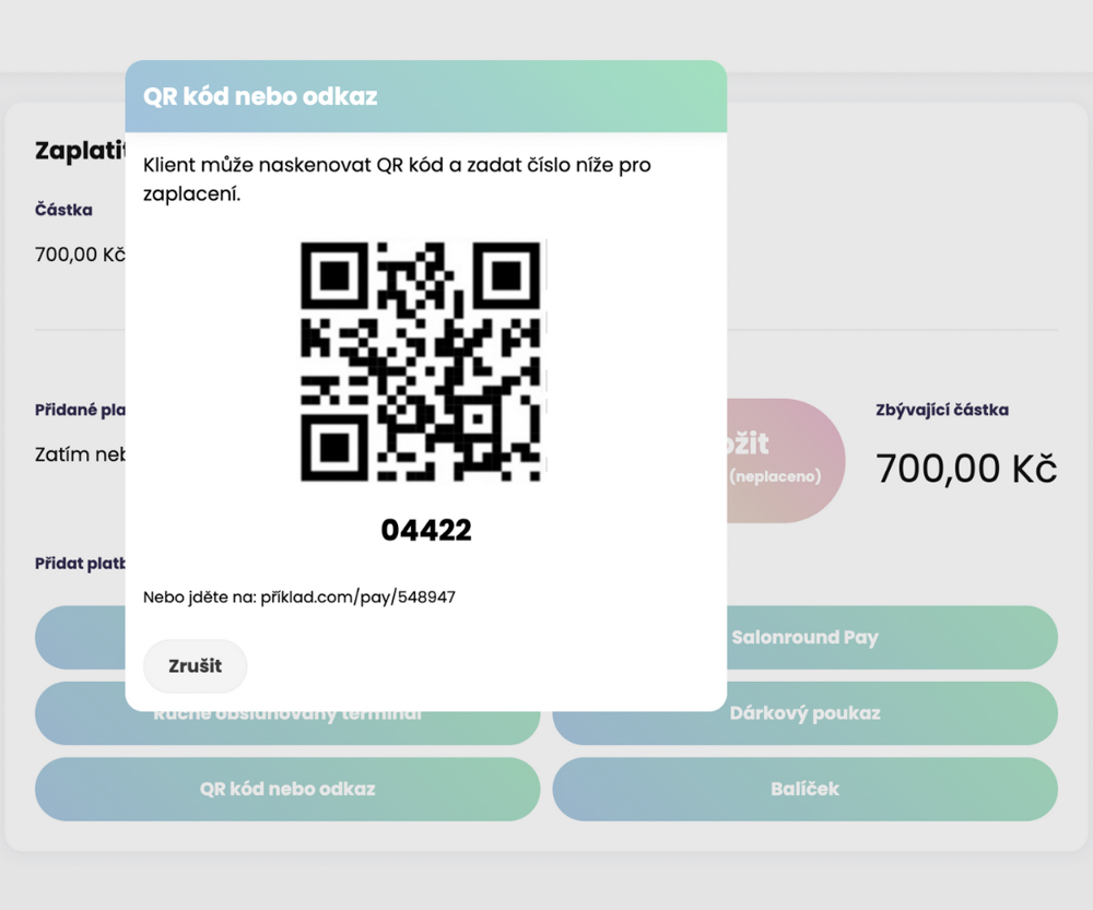 Kromě plateb kartou a hotovostí můžete klientům umožnit platbu telefonem pomocí QR kódu nebo otevřením platebního odkazu. Systém je plně integrovaný, takže jakmile je platba dokončena, ihned se zobrazí v pokladním systému.