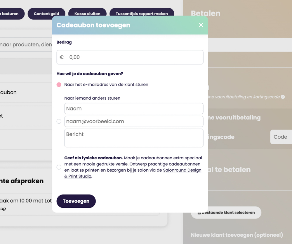 In slechts een paar klikken kun je via het kassasysteem cadeaubonnen verkopen. Vul een bedrag in en de klant mag beslissen of de cadeaubon naar het eigen e-mailadres of naar iemand anders wordt gestuurd. Je kunt ook fysieke cadeaubonnen verkopen die je zelf kunt ontwerpen en naar je salon kunt laten verzenden via de Salonround Design & Print Studio.