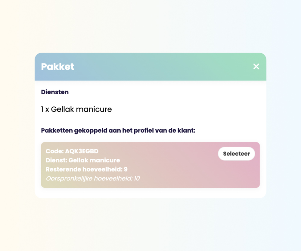 Via het kassasysteem kun je pakketten verkopen. Pakketten bevatten meerdere sessies van een specifieke dienst. Je kunt korting geven op de totaalprijs van een pakket om klanten te stimuleren een pakket te kopen en hierdoor vaker terug te komen.