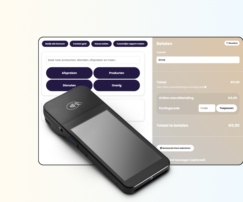 Een kassasysteem speciaal ontworpen voor salons waarmee je eenvoudig afspraken afrekent, producten verkoopt, cadeaubonnen aanbiedt en nog veel meer.