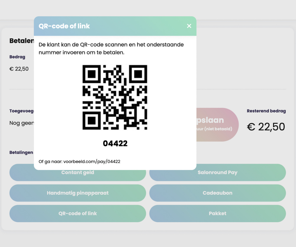 Naast het accepteren van pinbetalingen en contant geld, kun je klanten ook laten betalen via hun telefoon door hen een QR-code te laten scannen of een betaallink te laten openen. Alles is volledig geïntegreerd, dus zodra de betaling is voltooid, zie je dat direct in het kassasysteem.