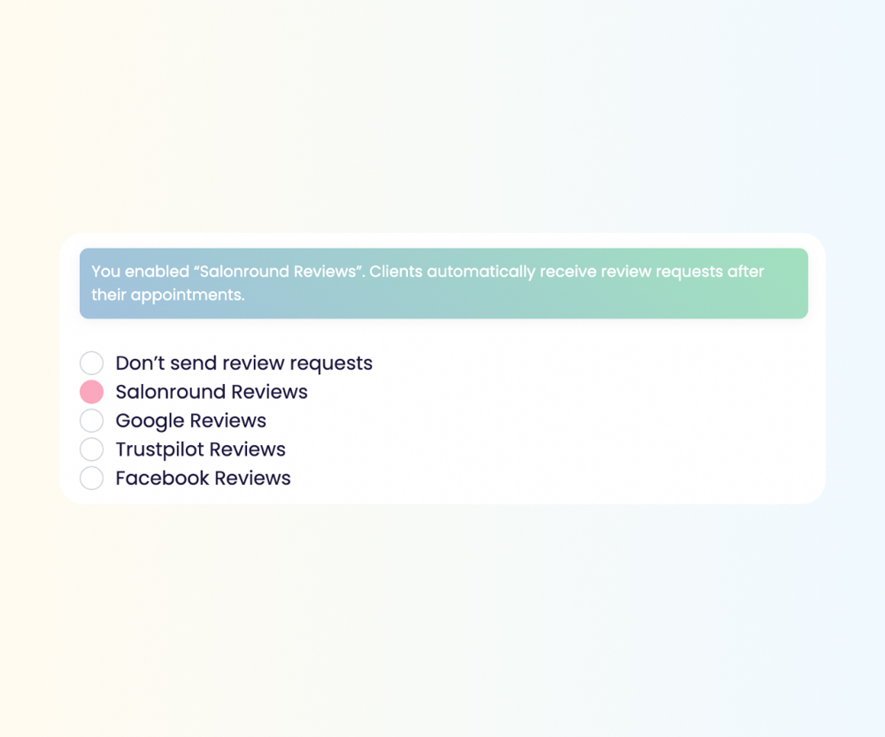 Try 14 days for freeWhether you want to receive Salonround Reviews, Google Reviews, Trustpilot Reviews, or Facebook Reviews, Salonround makes it easy to collect reviews.