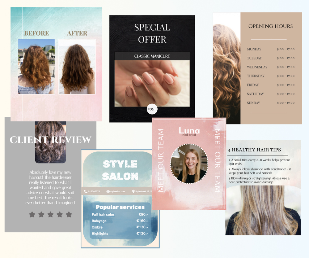 Er zijn bijvoorbeeld templates om je diensten te laten zien, je openingstijden te delen, tips te posten, kortingscodes te promoten, je team voor te stellen, voor-en-na resultaten uit te lichten, reviews van klanten te tonen, collages te maken en meer.