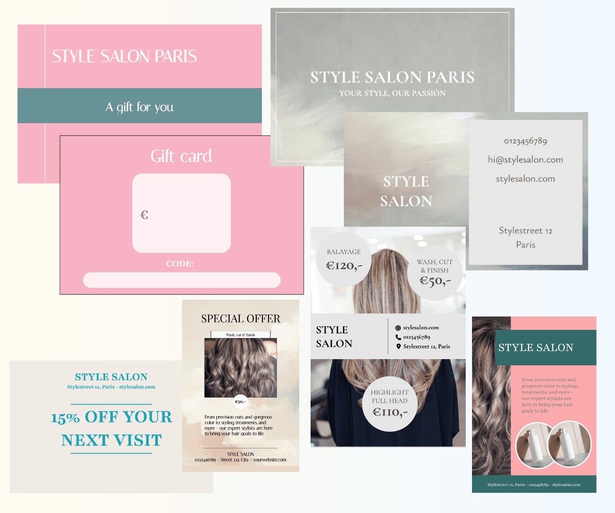 Met 200+ professionele templates die speciaal zijn ontworpen voor salons is marketingmateriaal voor je salon maken nog nooit zo makkelijk geweest. Alle templates zijn volledig aanpasbaar.